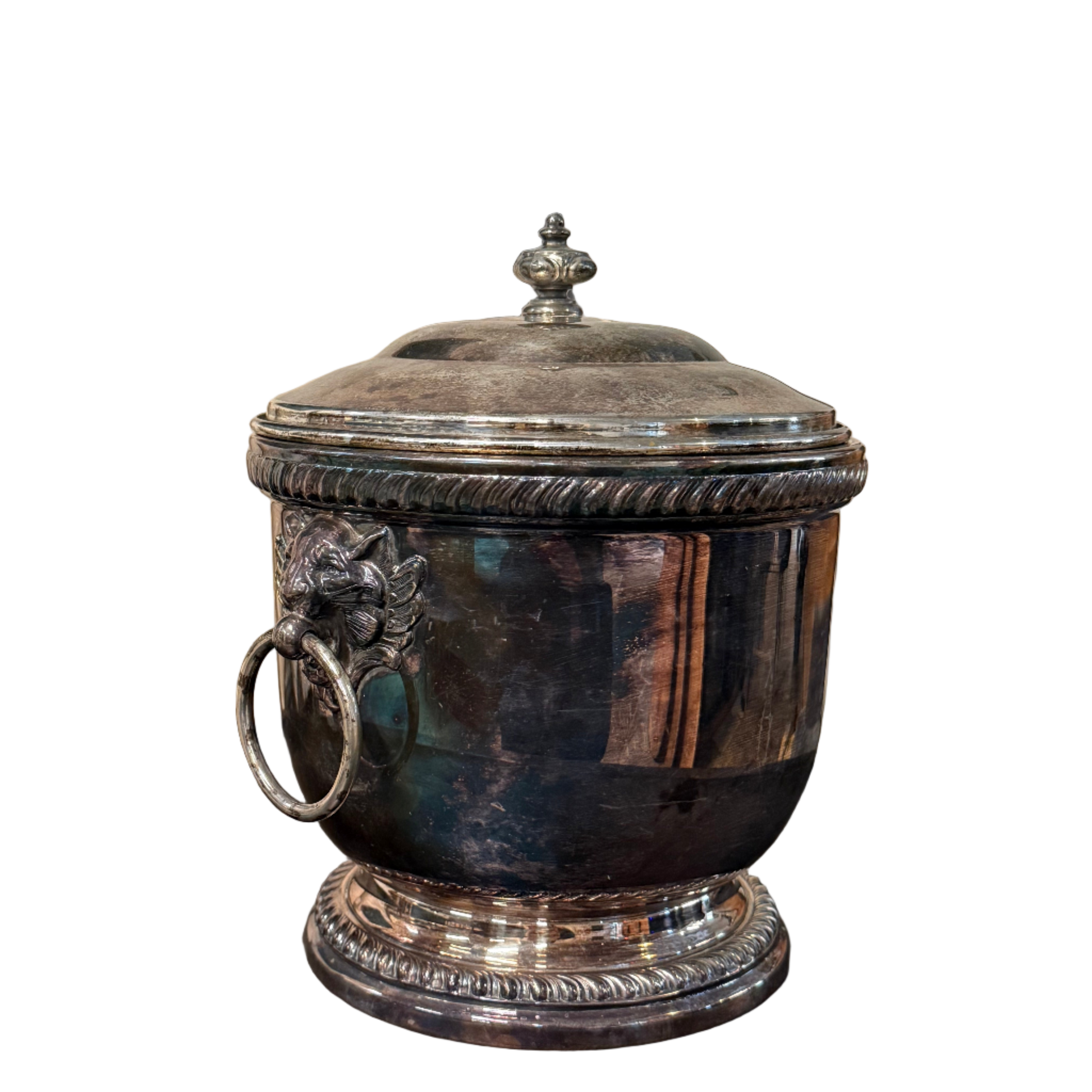 Antique Silver Plate Ice Bucket with lots of patina/tarnish. Can be polished with silver paste if a bright, shiny finish is preferred.