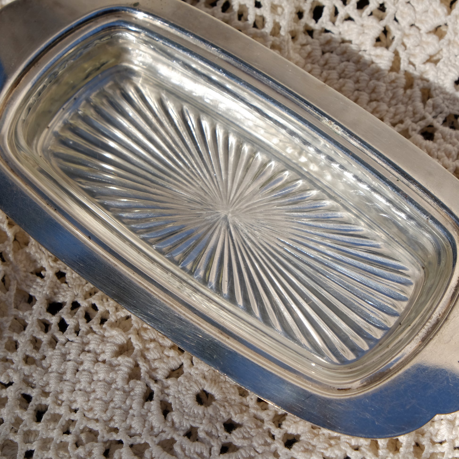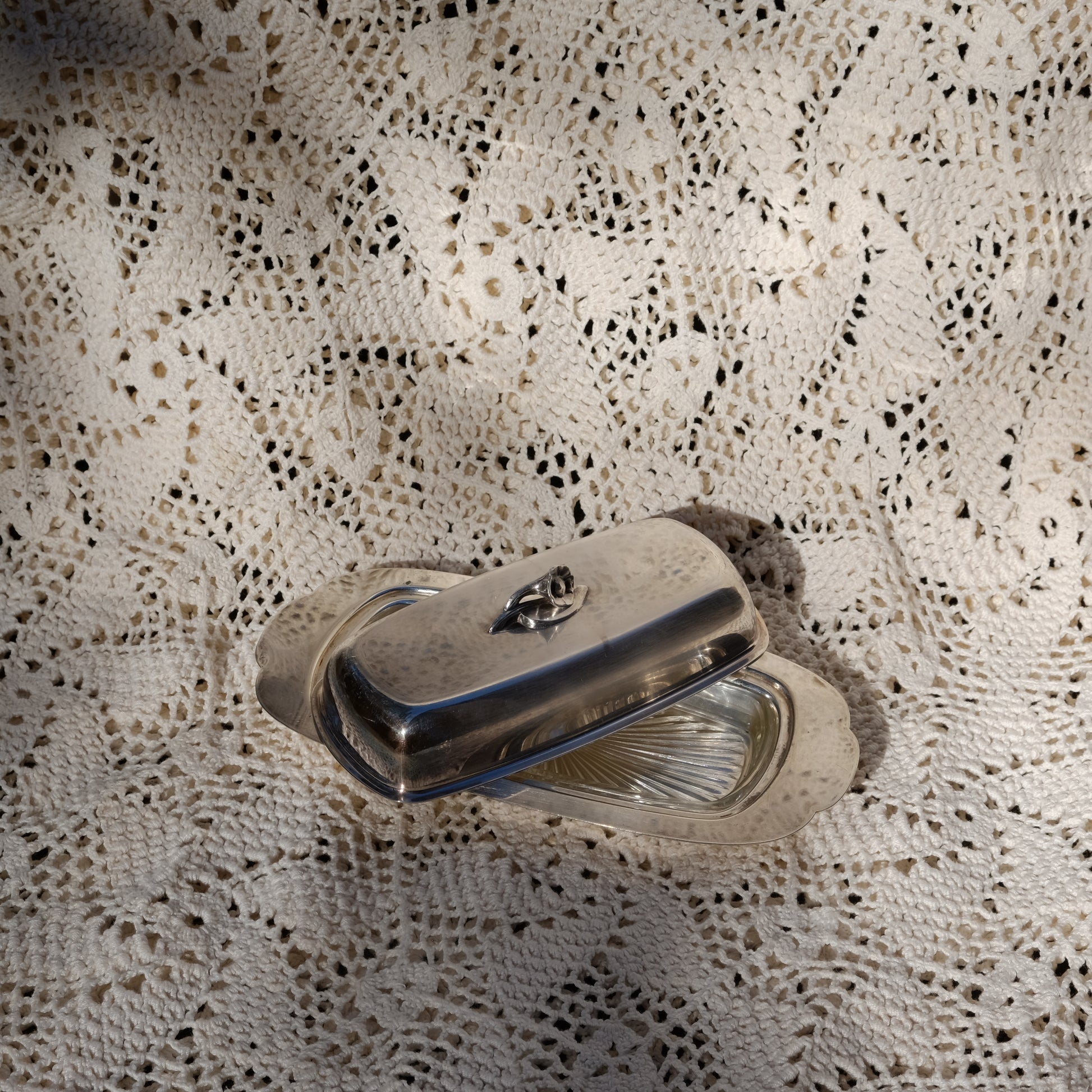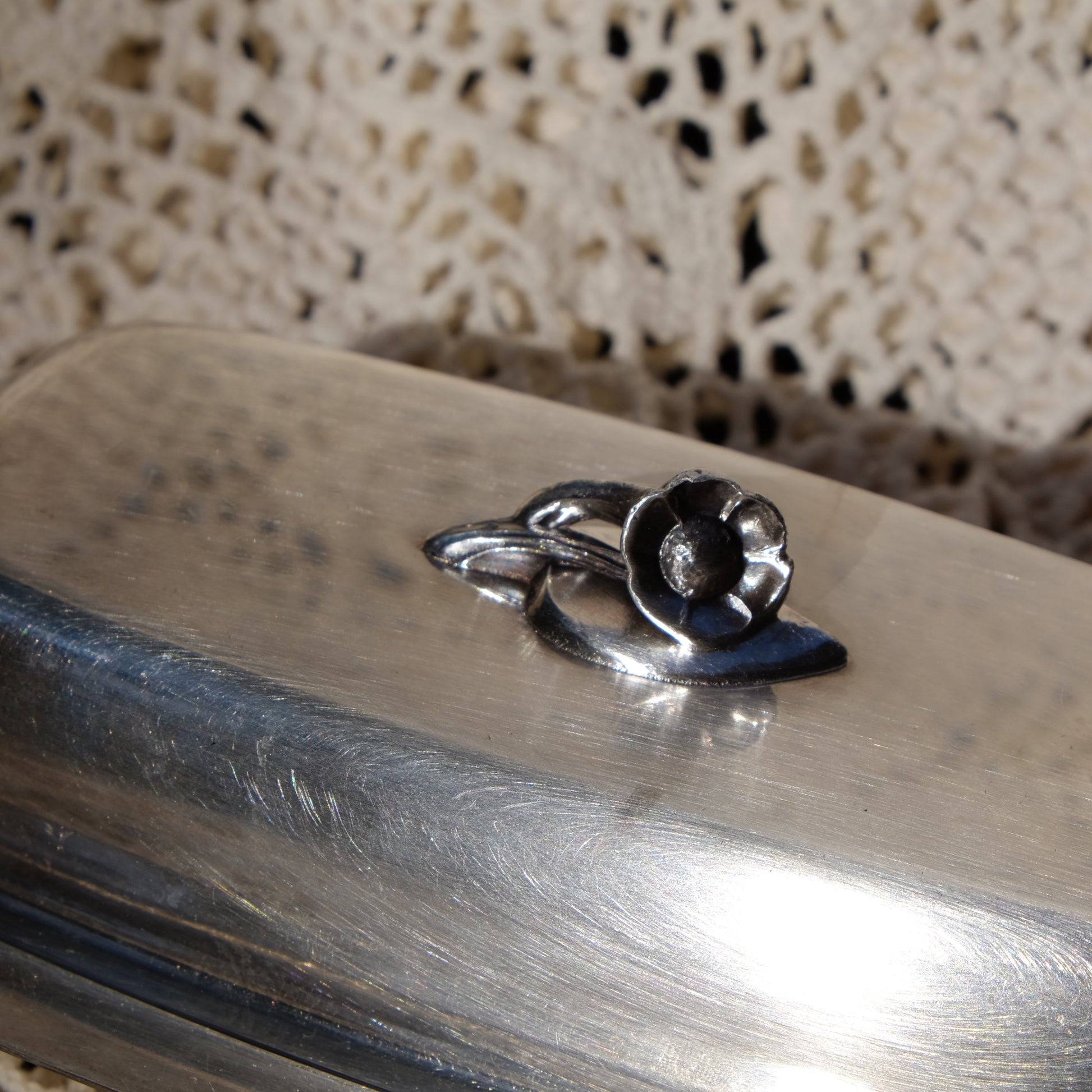 A beautiful blend of materials and motif. This butter dish features a vintage-inspired floral detail atop a sleek silver lid. The removable glass insert ensures your butter stays fresh and is easy to clean, making it a perfect marriage of form and function.