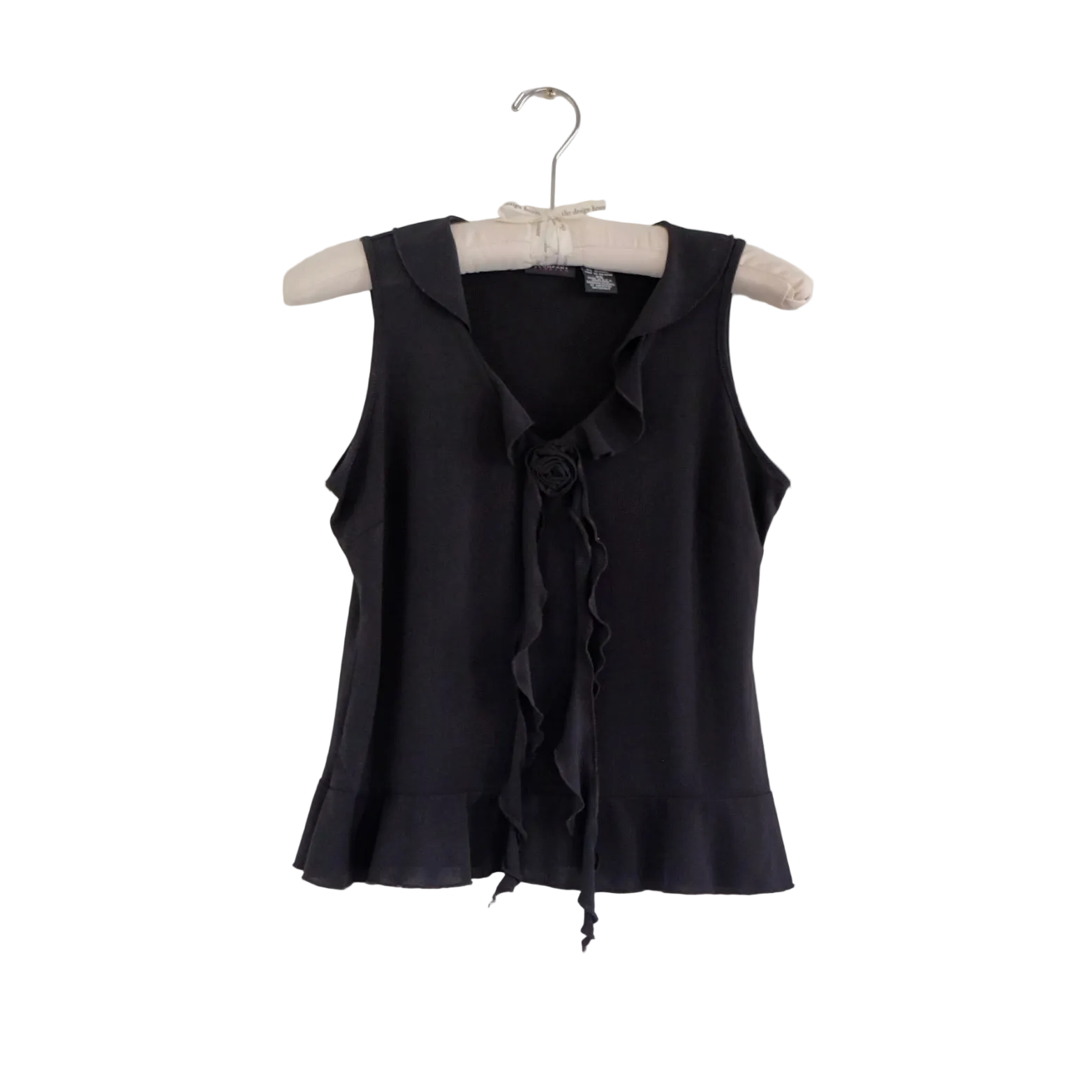Elevate your casual wardrobe with this vintageblack tank top, crafted with meticulous attention to detail. Featuring delicate ruffled accents and a charming flower tie at the neckline, this piece seamlessly blends timeless elegance with contemporary style. Made in the USA, it offers both quality craftsmanship and enduring appeal. Perfect for layering or wearing solo, this versatile tank transitions effortlessly from day to evening, making it an essential addition to any discerning wardrobe.