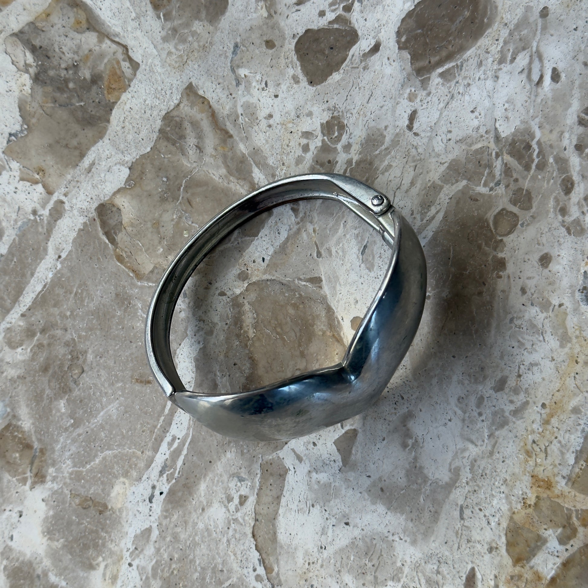 Silver metal heart cuff bracelet. Spring snap closure.