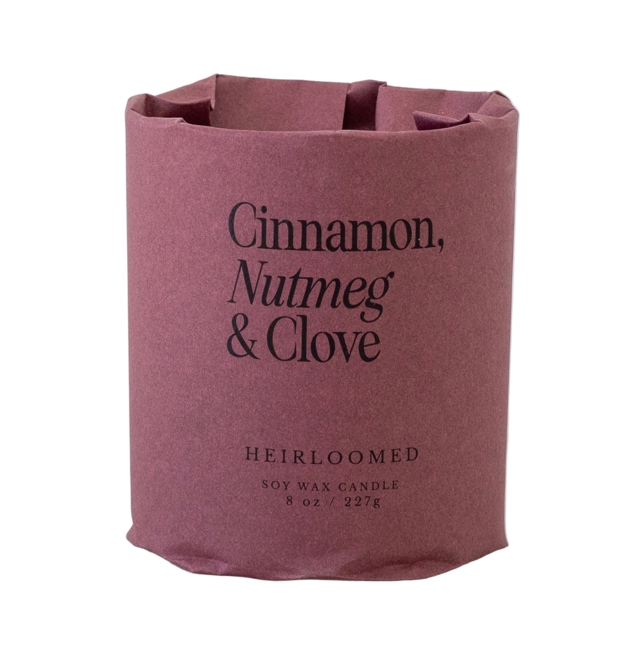 Heirloomed Candle - Cinnamon, Nutmeg & Clove - 8 oz Hand Poured Soy Wax Christmas Candle As part of our Fall Foundation Collection, our Heirloomed Wrapped Candles are hand-poured in our studio in Atlanta, GA. Each candle is 8 oz, featuring our signature, custom blended fragrance and is 100% soy wax poured in a straight-sided glass jar with cotton wick. 50+ hours burn time and clean burning with good scent throw. Our best-selling Cinnamon Spice candle with warm, nostalgic notes that remind you of a Cinnamon Broom at Christmas - this is the perfect, traditional scent for a holiday candle. Each candle in this collection comes packaged in a high-end signature matte paper wrap with labeled candle.