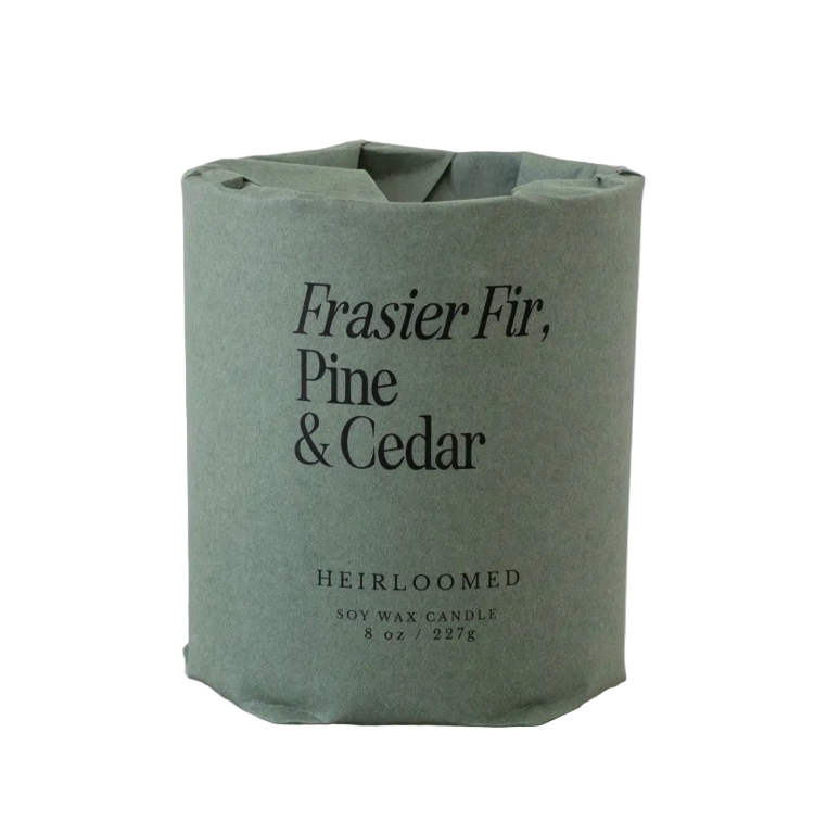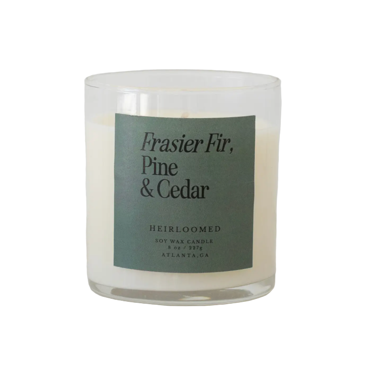 Heirloomed Candle - Frasier Fir, Pine & Cedar - 8 oz Hand Poured Soy Wax Christmas Candle As part of our Fall Foundation Collection, our Heirloomed Wrapped Candles are hand-poured in our studio in Atlanta, GA. Each candle is 8 oz, featuring our signature, custom blended fragrance and is 100% soy wax poured in a straight-sided glass jar with cotton wick. 50+ hours burn time and clean burning with good scent throw. Our best-selling Christmas Tree candle in Frasier Fir - this is the perfect, nostalgic scent for a holiday candle.