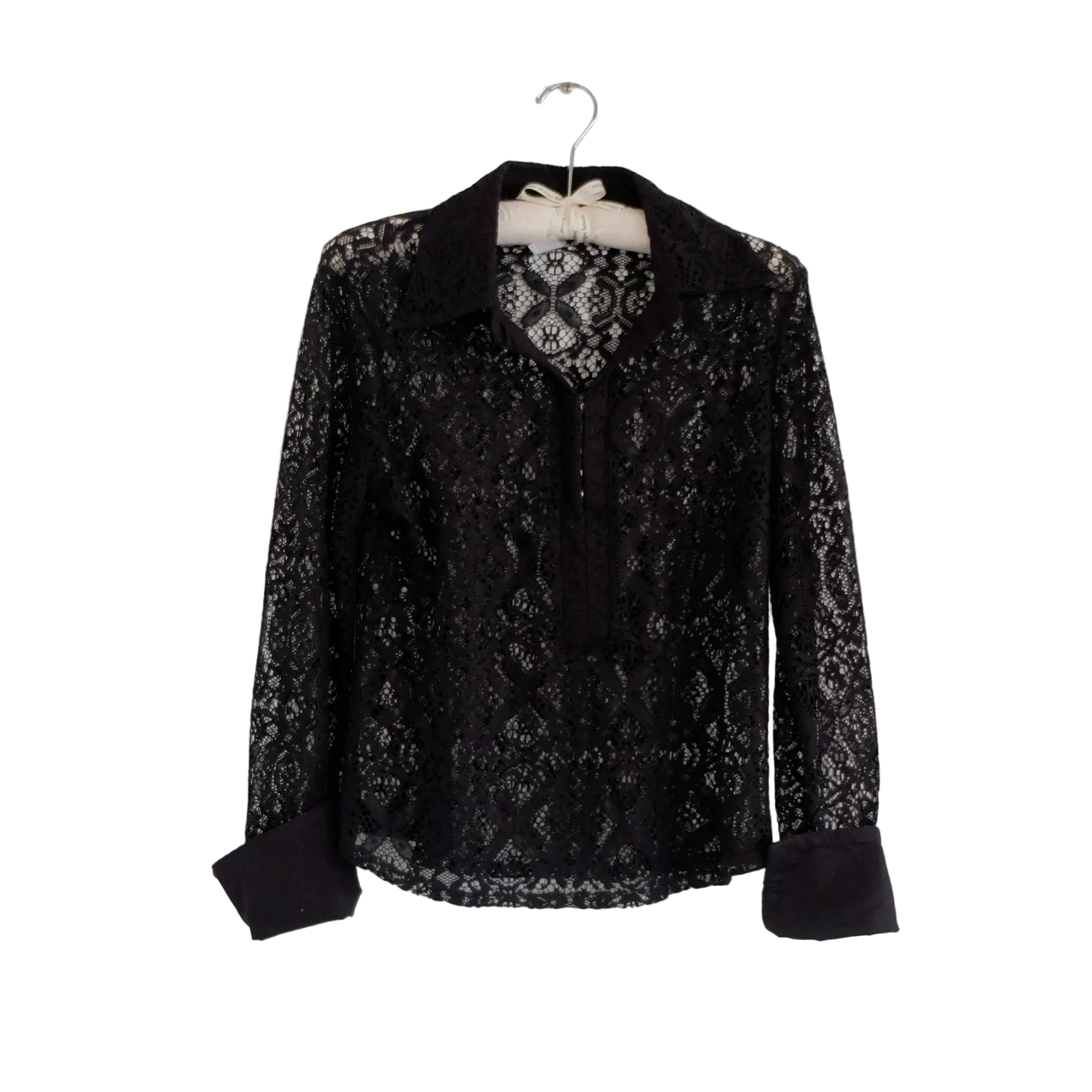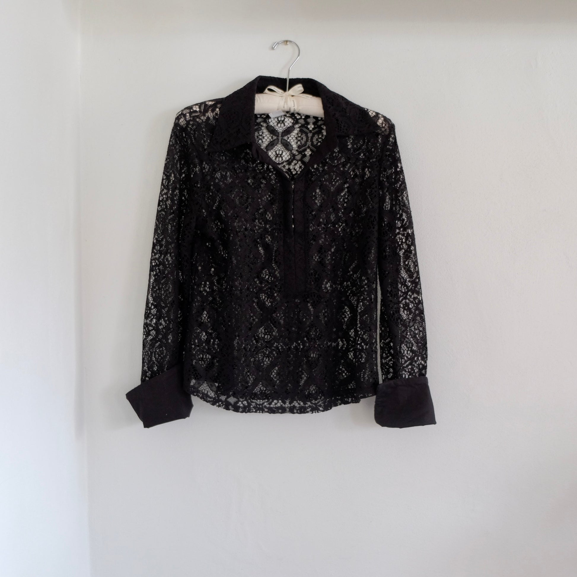 Elevate your vintage wardrobe with this striking sheer lace shirt, a seamless blend of 70s and 90s aesthetics. Featuring an iconic shaped collar and delicate black lace throughout, this size medium piece captures the essence of retro glamour with contemporary edge. The sheer construction adds an air of sophistication, making it perfect for layering or styling as a statement piece. A timeless addition for those who appreciate curated vintage fashion.