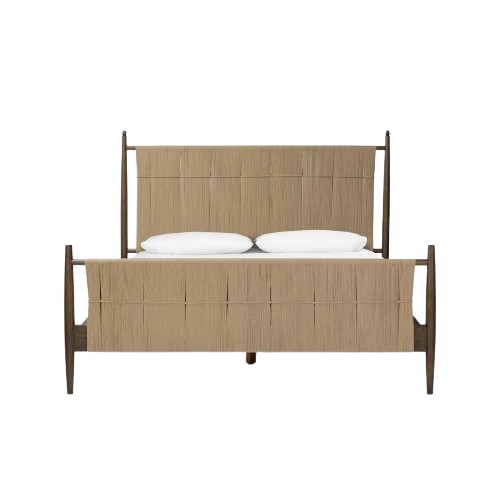 For a new take on heritage styling, classic weaving is updated with natural paper cord wrapping around the headboard and footboard. Spindle legs cap with finial details at the back, all grounded in a deep brown parawood.