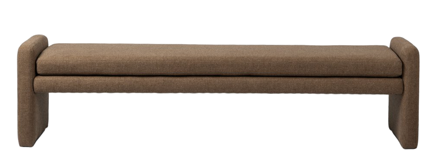 Rich, linen-blend upholstery covers a long, sophisticated dining bench.