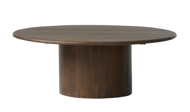 Elevate the look of your living space with a large-scale coffee table made from mixed reclaimed woods finished in a rich, warm brown. Pedestal base offers a solid, polished look.