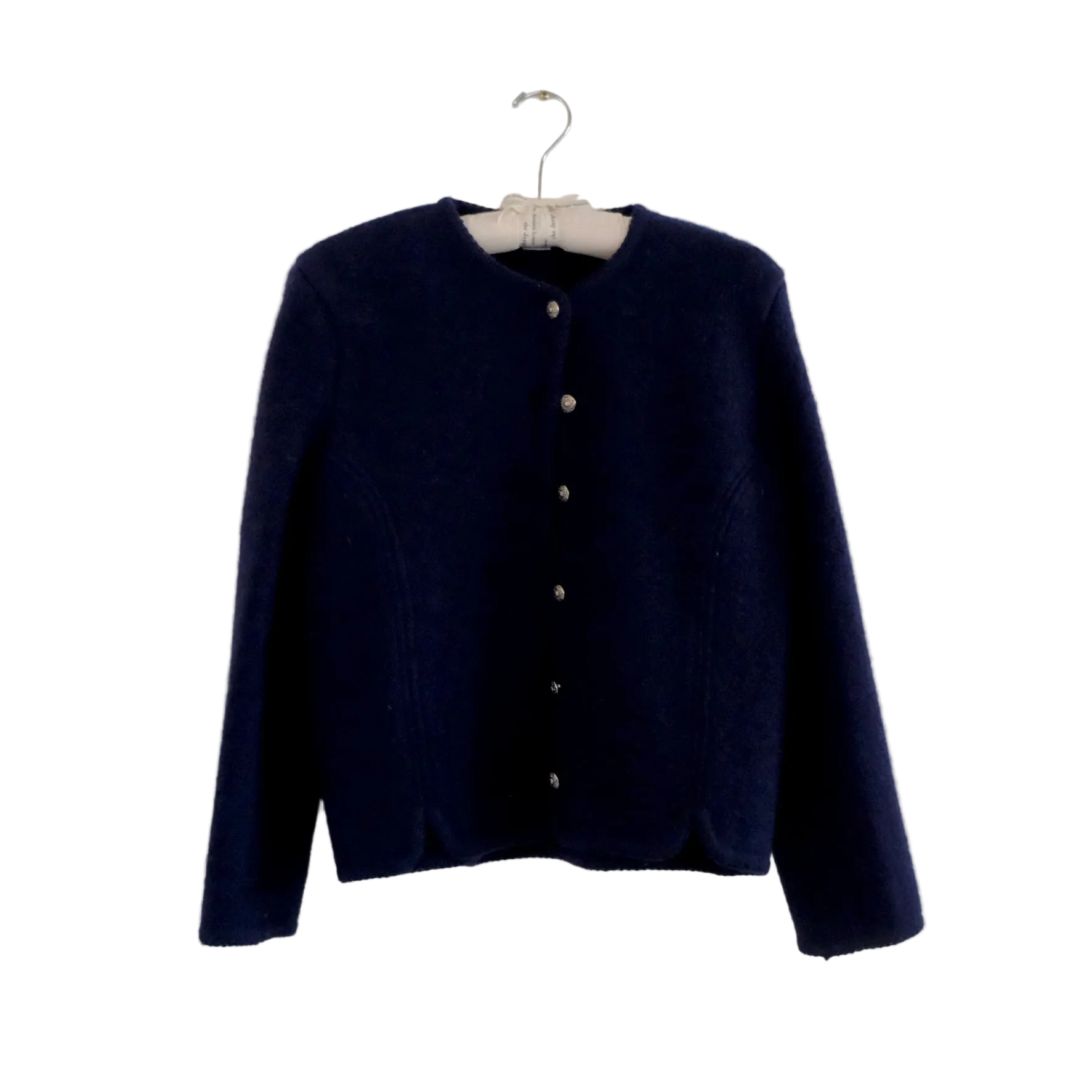 This navy wool collarless jacket embodies effortless sophistication with its clean, minimalist design. Constructed from 100% wool, it offers warmth and durability without compromising on style. Silver-detailed buttons provide a refined accent that elevates the preppy aesthetic, while the collarless neckline creates a contemporary silhouette. Versatile enough to pair with tailored trousers, midi skirts, or casual denim, this jacket transitions beautifully across seasons and occasions. A timeless investment piece that balances classic elegance with modern sensibility.